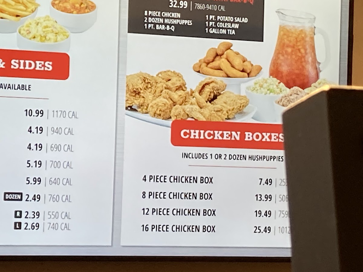 8 – Piece Chicken 2 – Dozen Hushpuppies 1 – PT. BAR-B-Q 1 – PT. Potato Salad 1 – PT. Coleslaw 1 – Gallon Tea